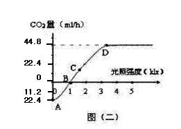 (2)在黑暗條件下,葉肉細(xì)胞中產(chǎn)生ATP的場(chǎng)所有 。當(dāng)光照強(qiáng)度處于圖(二)D點(diǎn)之后,對(duì)應(yīng)圖(一)中的CO2的擴(kuò)散途徑有____________ (以字母表示)。