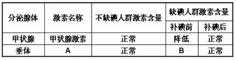 下列是缺碘與不缺碘的兩類人群中,血液內與甲狀腺活動密切相關的兩種激素含量狀況,下列對A、B表示的內容及B變化的原因敘述正確的是