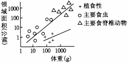 動(dòng)物為保證食物等生存資源而占據(jù)的空間叫領(lǐng)域。下圖表示各種鳥類的領(lǐng)域面積與體重、食性的關(guān)系,據(jù)圖分析正確的是