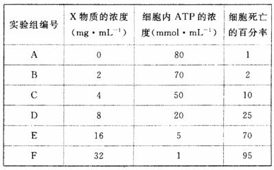 (4)為了研究X物質(zhì)對動物細(xì)胞的影響,某研究小組用不同濃度的X物質(zhì)將細(xì)胞處理24h,然后測量各組細(xì)胞內(nèi)ATP的濃度和細(xì)胞死亡的百分率。經(jīng)過多次實(shí)驗(yàn)后,所得數(shù)據(jù)如下表所示: