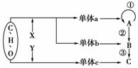 在生物體內(nèi),某些重要化合物的元素組成和功能關(guān)系如下圖所示。其中X、Y代表元素,A、B、C是生物大分子。據(jù)圖分析不正確的是 ( )