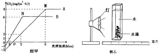 下圖甲表示在25℃時,A、B兩種植物隨著光照強度的變化CO2吸收量或CO2釋放量的變化曲線圖,圖乙是某同學(xué)“探究影響植物光合速率的因素”的實驗裝置圖。試回答: