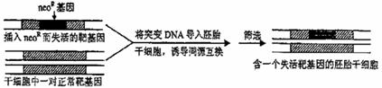 第三步:突變DNA與靶基因互換。將體外構(gòu)建的突變DNA轉(zhuǎn)移入胚胎干細(xì)胞,再通過同源互換,用失活靶基因取代兩個正常靶基因中的一個,完成對胚胎干細(xì)胞的基因改造。