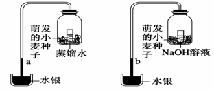 如圖所示,將等質(zhì)量的正在萌發(fā)的小麥種子,分別放在內(nèi)有一杯等體積的NaOH溶液或蒸餾水并用塞子塞緊的兩個(gè)瓶中,各瓶分別與一個(gè)水銀流體壓力計(jì)相連接,由此壓力計(jì)水銀柱升高的高度可以測(cè)量出某種氣體的變化量。開(kāi)始時(shí)兩個(gè)水銀流體壓力計(jì)的水銀柱a、b高度一致。將裝置放在適宜的條件下使種子萌發(fā),過(guò)一段時(shí)間后,會(huì)發(fā)現(xiàn)a、b高度是