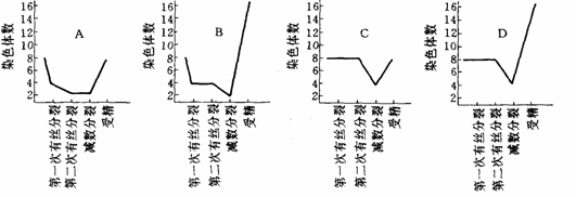 一個(gè)有8條染色體的細(xì)胞發(fā)生了二次有絲分裂和一次減數(shù)分裂,有一個(gè)子細(xì)胞受精了。下圖中A~D各圖中,代表了上述細(xì)胞中染色體數(shù)目變化的是