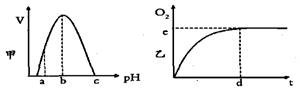 下圖甲是H2O2酶活性受pH影響的曲線,圖乙表示在最適溫度下,pH =b時H2O2分解產(chǎn)生的O2量隨時間的變化(不考慮H2O2的自然分解)。若該酶促反應過程中改變某一初始條件,以下改變正確的是 ( 。