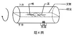 .將一玉米幼苗固定在支架上,支架固定在溫、濕度適宜且底部有一透光孔的暗室內(nèi),從下圖所示狀態(tài)開始,光源隨暗室同步緩慢勻速旋轉(zhuǎn),幾天后停止于起始位置。此時(shí),幼苗的生長(zhǎng)情況是( )