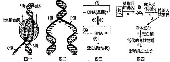 (4)圖四中Bt為控制晶體蛋白合成的基因,則要用 分別切割載體和Bt基因,載體的粘性末端與目的基因DNA片段的粘性末端就可通過 原則而結(jié)合。之后還需要用 酶將切口縫合, d過程對應(yīng)于圖三中 過程(填序號)。若d過程結(jié)束所得的物質(zhì)由M個(gè)氨基酸構(gòu)成,含有N條肽鏈,其中有Z條環(huán)狀肽鏈,則該物質(zhì)完全水解共需水分子個(gè)數(shù)為 。圖中活化的毒性物質(zhì)應(yīng)是一種 分子。