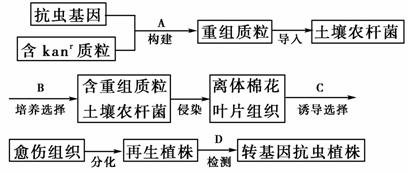 ①A過程需要的酶主要有限制性內(nèi)切酶和DNA連接酶 ②B過程需要加入卡那霉素進行選擇培養(yǎng)、跜過程為脫分化過程,培養(yǎng)基中只需加入營養(yǎng)物質(zhì)、瓊脂和激素、蹹過程可以用放射性同位素(或熒光分子)標記的抗蟲基因作為探針進行分子水平的檢測 ⑤D過程可以用蟲感染植株進行個體水平的檢測