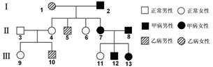 ⑶ 若III-9和III-12婚配,子女中只患甲或乙一種遺傳病的概率為_____▲______;同時患兩種遺傳病的概率為________▲____。