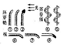 當(dāng)植物受到環(huán)境刺激時(shí),右圖中所表示的生長(zhǎng)素分布與生長(zhǎng)的情形正確的是(黑點(diǎn)代表生長(zhǎng)素的分布)