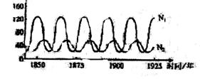 寒帶針葉林中兩個動物種群(N1、N2)的數(shù)量變化如右圖所示。據(jù)圖判斷這兩個種群的關系是:( )![]()