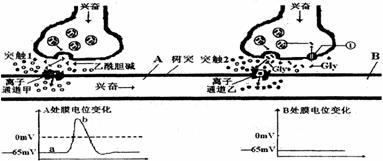 (3)甘氨酸(Gly)在中樞神經(jīng)系統(tǒng)中可作為神經(jīng)遞質(zhì),它的受體是膜上某些離子的通道。當興奮抵達時,貯存在 內(nèi)的Gly釋放出來,并與分布在 上的Gly受體結(jié)合。當Gly與受體結(jié)合后,通道開啟,使 (陰/陽)離子內(nèi)流,導致A處的興奮不能傳至B處。此時B處的膜電位表現(xiàn)為_________________。釋放到突觸間隙的Gly可通過主動運輸進入細胞再被利用,圖1中結(jié)構(gòu)①表示 。上述過程體現(xiàn)了細胞膜具有的功能是 ____ 。