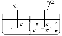 用帶有一個小孔的隔板把水槽分成相等的左右兩室,把磷脂分子引入隔板小孔使之成為一層薄膜。水槽左室加入50ml含少量K+的溶液并插入負(fù)電極,右室加入50ml含大量K+的溶液并插入正電極(如右圖所示)。下列相關(guān)分析正確的是 ( )