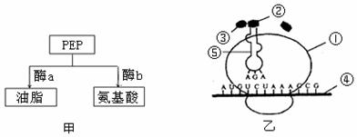 油菜植物體內(nèi)的中間代謝產(chǎn)物磷酸烯醇式丙酮酸(PEP)運(yùn)向種子后有兩條轉(zhuǎn)變途徑,如圖甲所示,浙江農(nóng)科院陳錦清教授根據(jù)這一機(jī)制培育出高產(chǎn)油油菜,產(chǎn)油率由原來(lái)的35%提高到58%。其中酶a和酶b分別由基因A和基因B控制合成,圖乙是基因A或B表達(dá)的部分過(guò)程。請(qǐng)回答: