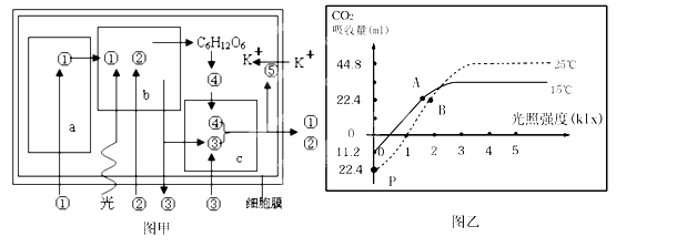 下圖甲是某植物細(xì)胞代謝過程示意圖(圖中數(shù)字代表物質(zhì),a、b、c代表細(xì)胞器),圖