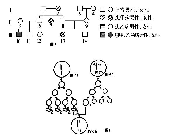 (4)假定Ⅲ-11與Ⅲ-15結(jié)婚,若a卵與e精子受精,發(fā)育出的Ⅳ-16患兩種病,Ⅳ-16基因型是________。若a卵與b精子受精,則發(fā)育出的Ⅳ-17的基因型是________,表現(xiàn)型是