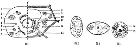 圖1是兩種高等生物細胞亞顯微結(jié)構(gòu)模式圖。圖2-4是圖1中部分結(jié)構(gòu)的放大,據(jù)圖回答。( [ ]內(nèi)填圖中標(biāo)號, 上填適當(dāng)內(nèi)容的文字。)