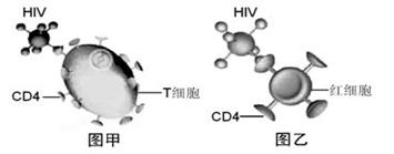 HIV能通過細胞表面的CD4(一種受體蛋白)識別T細胞(如圖甲),如果給AIDS患者注射大量用CD4修飾過的紅細胞,紅細胞也會被HIV所識別、入侵(如圖乙)。因HIV在紅細胞內(nèi)無法增殖,紅細胞成為HIV的“陷阱細胞”。這為治療AIDS提供了新的思路。據(jù)材料分析,下列敘述不正確的是