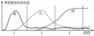 B.甲、乙、丙之間為競爭關(guān)系,第3階段群落具有明顯的垂直分層現(xiàn)象