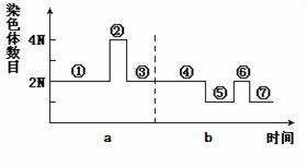 右圖表示某二倍體生物細(xì)胞分裂過程中染色體數(shù)目的變化曲線,a為有絲分裂,b為減數(shù)分裂,①~⑦表示其間的某些階段。下列有關(guān)敘述中正確的是