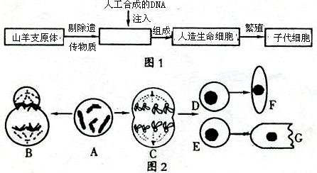 下圖1表示美國(guó)J.Craig Venter研究所創(chuàng)造“人造生命”的過(guò)程,圖2是山羊細(xì)胞(假設(shè)2N=4)的部分生命過(guò)程。請(qǐng)據(jù)圖回答: