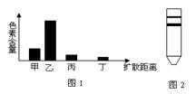 (4)同學(xué)甲做實(shí)驗(yàn)⑤后,繪制了四種色素在濾紙上分離情況(如圖1所示)。據(jù)圖分析,溶解度最大的色素是 ;同學(xué)乙由于研磨綠葉過(guò)程中漏加了某些試劑或藥品,導(dǎo)致實(shí)驗(yàn)結(jié)果不理想(如圖2所示),該同學(xué)漏加的試劑或藥品是 。