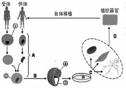 (1)過程A表示 ,是目前實現(xiàn)體細胞克隆的關鍵技術,該技術的主要操作是應用患者的體細胞作為核供體,由 [ ① ] 細胞提供細胞質,進行人工重組。