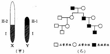 甲圖為人的性染色體簡(jiǎn)圖。X和Y染色體有一部分是同源的(甲圖中I片段),該部分基因互為等位:另一部分是非同源的(甲圖中的Ⅱ—1,Ⅱ—2片段),該部分基因不互為等位。請(qǐng)回答: