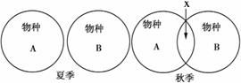 下圖代表生活在同一生態(tài)系統(tǒng)中兩個(gè)種群在夏季和秋季的食區(qū)范圍。兩個(gè)種群均以橡樹為食,圖中X所指部分最可能表明( )