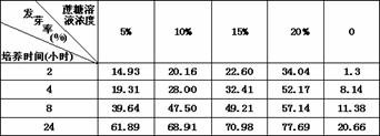 中國櫻桃花粉在不同濃度蔗糖溶液中的萌發(fā)率(%)不同,實(shí)驗(yàn)小組記錄的數(shù)據(jù)如右圖,根據(jù)以上數(shù)據(jù)得出的結(jié)論中,錯(cuò)誤的是 ( )