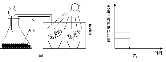 下圖甲裝置為含水量較少的種子呼吸作用及幼苗光合作用實(shí)驗(yàn)圖,圖乙中的曲線表示種子呼吸作用(虛線)和幼苗光合作用(實(shí)線)的強(qiáng)度變化過(guò)程。請(qǐng)回答: