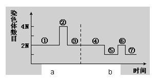 右圖表示某二倍體生物細(xì)胞分裂過(guò)程中染色體數(shù)目的變化曲線,a為有絲分裂,b為減數(shù)分裂,①~⑦表示其間的某些階段。下列有關(guān)敘述中正確的是![]()