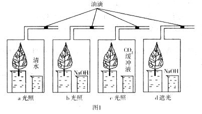 某學(xué)校興趣小組利用圖1實驗裝置進行實驗。圖1中a、b、c、d 4個裝置中的葉片是取自同一植物,且它們的形態(tài)、大小、生長狀況都相同;大燒杯中的液體可以保證葉片所需的水與無機鹽的正常供應(yīng);通過觀察油滴的運動可判斷氣體的變化情況(不考慮氣體在水中的溶解與外界氣壓的變化和蒸騰作用的影響)。圖2是葉肉細(xì)胞在不同光照強度下葉綠體與線粒體代謝簡圖,下列敘述中正確的是( )