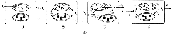 D.在較弱光照條件下,圖1裝置c中葉肉細(xì)胞的狀態(tài)為圖2中的④,此時,N1小于m2