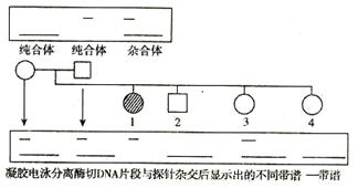 一對等位基因經(jīng)某種限制性內(nèi)切酶切割后形成的DNA片斷長度存在差異,凝膠電泳分離酶切后的DNA片段,與探針雜交后可顯示出不同的帶譜。根據(jù)該特性,就能將它作為標記定位在基因組的某一位置上,F(xiàn)有一對夫婦生了四個兒女,其中1號性狀特殊(如右圖),由此可推知這四個兒女的基因型(用D、d表示)正確的是 ( )![]()