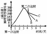 現(xiàn)用體重等方面大體相同的三組兔子進(jìn)行實(shí)驗(yàn)。將含有放射性碘的注射液注射到A、B、C三組兔子的體內(nèi),然后,定時(shí)測定兔子甲狀腺的放射量。4天后,分別注射①無放射性的甲狀腺激素、②無放射性的促甲狀腺激素、③生理鹽水,實(shí)驗(yàn)結(jié)果如圖所示。則A、B、C表示分別注射的是![]()