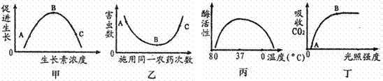 D 丁圖中,要提高農(nóng)作物產(chǎn)量,光照強度應大于B點