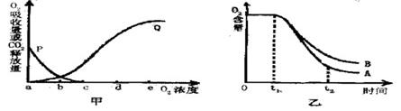 下圖甲表示小麥種子在不同氧氣濃度下的氧氣吸收和無氧呼吸過程中二氧化碳的釋放量。圖乙表示等量的A、B兩份小麥種子分別置于兩個容積相同、密封的廣口瓶內(nèi),各加入適量(等量)的水,在不同溫度下瓶內(nèi)O2含量變化。請回答: