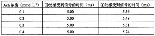 乙酰膽堿(Ach)是一種神經(jīng)遞質(zhì)。實驗人員欲研究Ach的濃度與反應時間的關系(簡圖如右圖)。在除去突觸小泡的前提下自①處注入不同濃度的Ach,②處給予恒定刺激,③、④兩處分別,為感應測量點。測得不同濃度.Ach條件下③、④兩處感受到信號所用時間如下表所示。下列敘述正確的是![]()