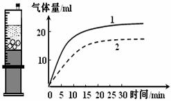 將一個土豆(含有過氧化氫酶)切成大小和厚薄相同的若干片,放入盛有一定體積和濃度的過氧化氫溶液的針筒中(如右圖所示),土豆片為4片時,在溫度為35℃的條件下,每隔5分鐘收集一次數(shù)據(jù),根據(jù)數(shù)據(jù)繪制出如圖曲線1。利用同樣的實驗裝置,改變某條件后收集數(shù)據(jù)可繪制出曲線2。改變的條件是