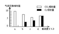 下圖表示某植物的非綠色器官在氧濃度為a、b、c、d時,測得的CO2釋放量和O2吸收量的變化。下列敘述正確的是