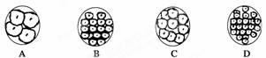 實(shí)驗(yàn)中用同一顯微鏡觀察了同一裝片4次,每次僅調(diào)整目鏡或物鏡和細(xì)準(zhǔn)焦螺旋,結(jié)果得到下面各圖。請(qǐng)問其中視野最暗的是 ( )