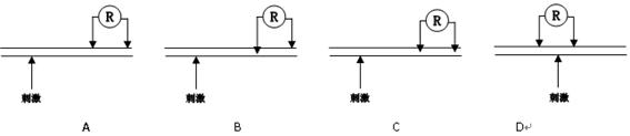 用連著微伏表的兩個(gè)電極測(cè)試受刺激后的神經(jīng)纖維上的電位變化,已知該纖維靜息電位為-70mv,如果微伏表上發(fā)生一次持續(xù)約1ms的電位差的變化:由-70mv上升到0,再繼續(xù)上升至+40mv,然后再下降恢復(fù)到-70mv,則刺激部位和微電極放置位置,正確的是![]()