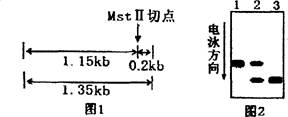 已知正常的β珠蛋白基因(以βA表示)經(jīng)Mst I限制酶切割后可得到長度為1. 15kb和o.2kb的兩個片段(其中0.2kb的片段通常無法檢測到),異常的β珠蛋白基因(以βS表示)由于突變恰好在Mst I限制酶切割點上,因而失去了該酶切位點,經(jīng)Mst I限制酶處理后只能形成一個1.35kb的DNA片段,如圖l;現(xiàn)用Mst I限制酶對編號為1、2、3的三份樣品進行處理,并進行DNA電泳,結(jié)果如圖2,則1、2、3號樣品的基因型分別是(以βA、βS表示相關(guān)的基因)![]()