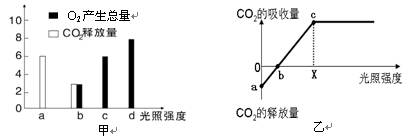 圖甲表示水稻的葉肉細胞在光照強度分別為a、b、c、d時,單位時間內CO2釋放量和O2產生總量的變化。圖乙表示藍藻光合作用速率與光照強度的關系。有關說法正確的是![]()