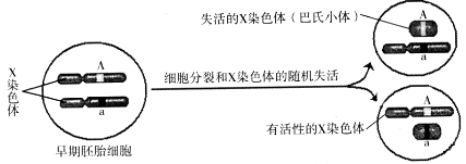 貓是XY型性別決定的二倍體生物,當(dāng)貓細(xì)胞中存在兩條或兩條以上的X染色體時(shí),只有一條X染色體上的基因能表達(dá),其余X染色體高度螺旋化失活成為巴氏小體,如下圖所示。請回答:![]()