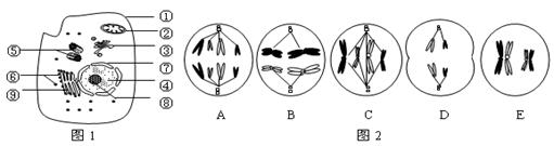 圖1是高等動(dòng)物細(xì)胞亞顯微結(jié)構(gòu)示意圖,圖2中5個(gè)細(xì)胞是某種生物不同細(xì)胞分裂時(shí)期的示意圖。請據(jù)圖回答以下問題:![]()