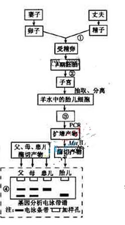 一對(duì)表現(xiàn)型正常的夫婦,生了一個(gè)鐮刀型細(xì)胞貧血癥(常染色體隱性遺傳。┗純。在他們欲生育第二胎時(shí),發(fā)現(xiàn)妻子的雙側(cè)輸卵管完全堵塞,不能完成體內(nèi)受精。醫(yī)生為該夫婦實(shí)施了體外受精和產(chǎn)前基因診斷,過(guò)程如右圖。![]()