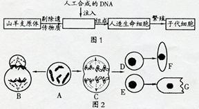 下圖1表示美國(guó)J.Craig Venter研究所創(chuàng)造“人造生命”的過(guò)程,圖2是山羊細(xì)胞(假設(shè)2N=4)的部分生命過(guò)程。請(qǐng)據(jù)圖回答:![]()